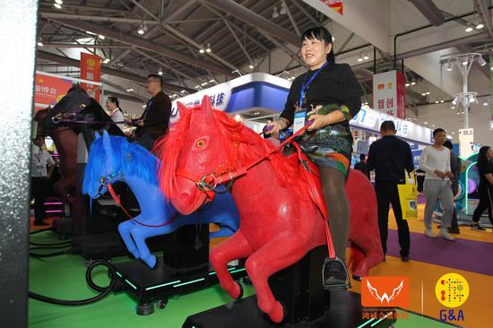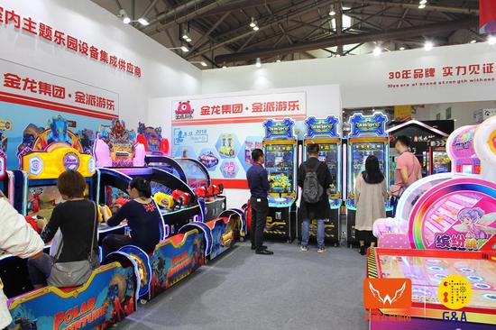 如金馬科技的GJT-60A觀景塔、ZB-72A轉轉杯、3D互動軌道車;世宇的動感戰(zhàn)機、怪獸獵人、一球成名、糖果扭扭蛋;華立的瘋狂兔子、頭文字D ZERO、巨獸浩劫2幸運光圈;大新的裝配式智能泳池;通利動漫:粉紅格格禮品機,海綿寶寶游樂設備;牧童的叢林水寨、皮筏滑梯、牧童繽紛水屋,日東的繽紛射球、旋風摩托;智跑的中型懸掛過山車、彈射過山車;金滿鴻的樂吧車、戰(zhàn)火金剛、幻影摩托;燁睿的一推天下、YOYO派對;兩只老虎的翻滾車、倉鼠球……
